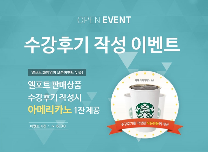 ◈ 대상: 엘포트 제휴사 상품 수강생 ◈ 기간: 2017-06-01 ~ 2017-06-30 ◈ 내용: 홈페이지 "수강후기" 게시판에 300byte 이상 수강후기를 작성한 모든분들께 스타벅스 아메리카노(1잔) 기프티콘을 보내드립니다^^