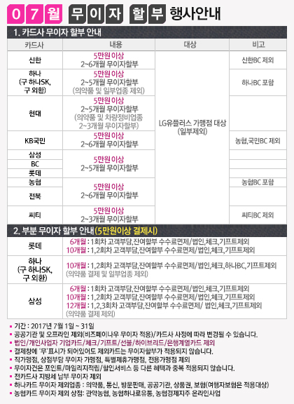 2017년 7월 카드 무이자 할부행사안내입니다. (부분 무이자포함) 카드 결제 시 참고하시기 바랍니다.