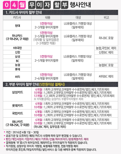 2016년 04월 카드 무이자 할부 행사안내입니다. (부분 무이자포함)