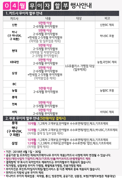 2018년 4월 카드 무이자 할부 행사안내입니다. (부분 무이자포함) 카드 결제 시 참고하시기 바랍니다. 감사합니다.