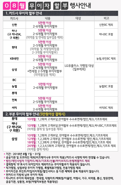 2018년 8월 카드 무이자 할부 행사안내입니다. (부분 무이자포함) 카드 결제 시 참고하시기 바랍니다. 감사합니다.