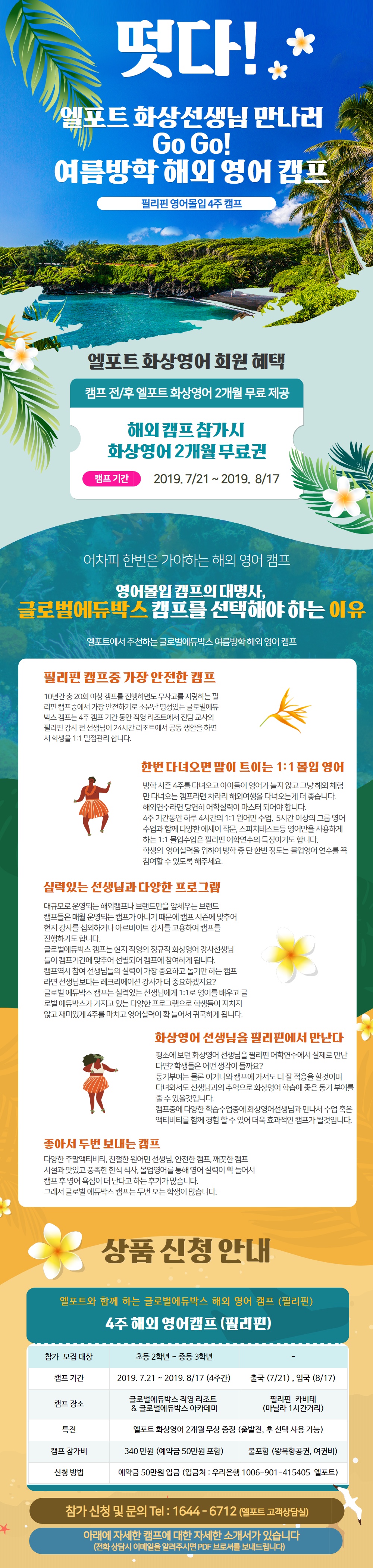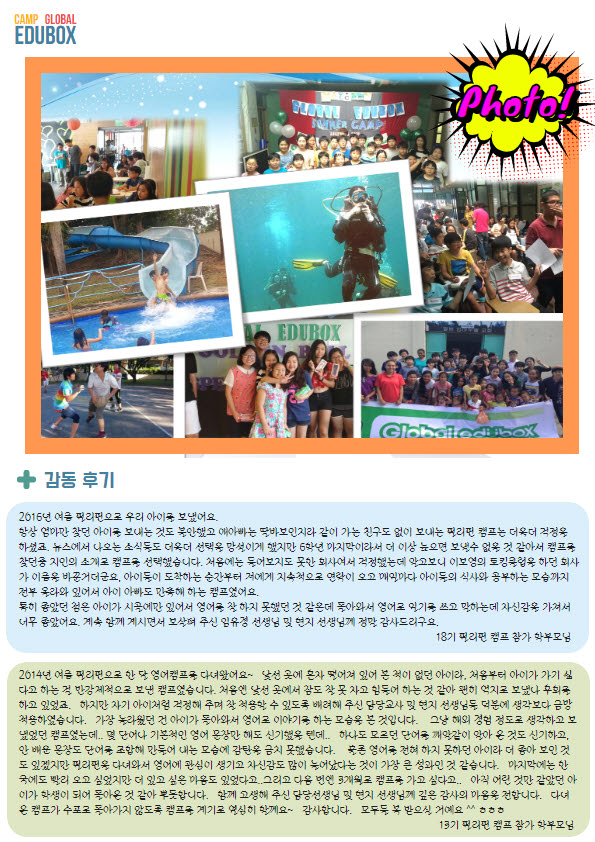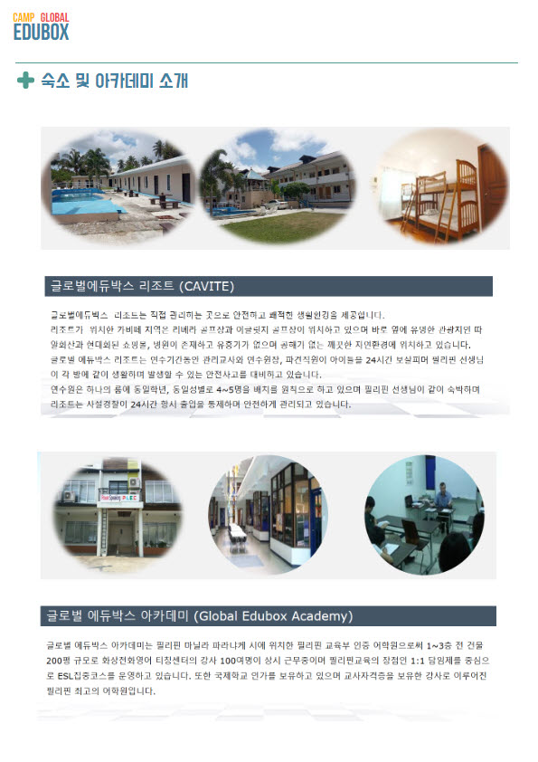 엘포트가 추천하는 해외 여름방학 영어캠프 (4주) 코스 입니다. 필리핀 엘포트 직영 캠프인 글로벌에듀박스 캠프는 총 20회가 넘는 방학기간동안 무사고로 안전한 캠프입니다. 영어몰입학습으로 엘포트스픽업이 자랑하는 원어민 선생님과 함께 1:1 영어학습을 캠프 기간 동안에 학습하는 영어몰입캠프로 회원분을 초대합니다.