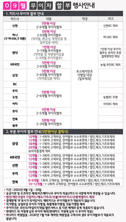 2020년 09월 카드 무이자 할부 행사안내입니다. (부분 무이자 포함)