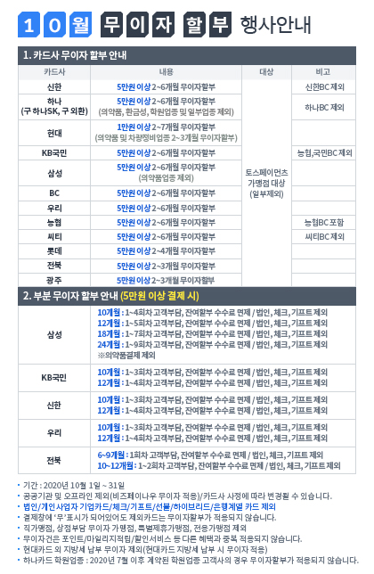 2020년 10월 카드 무이자 할부 행사안내입니다. (부분 무이자 포함)
