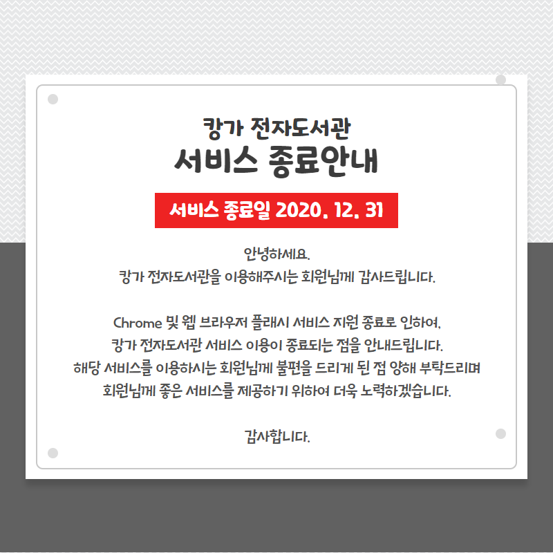 캉가 전자도서관 서비스 이용이 종료되는 점을 안내드립니다.