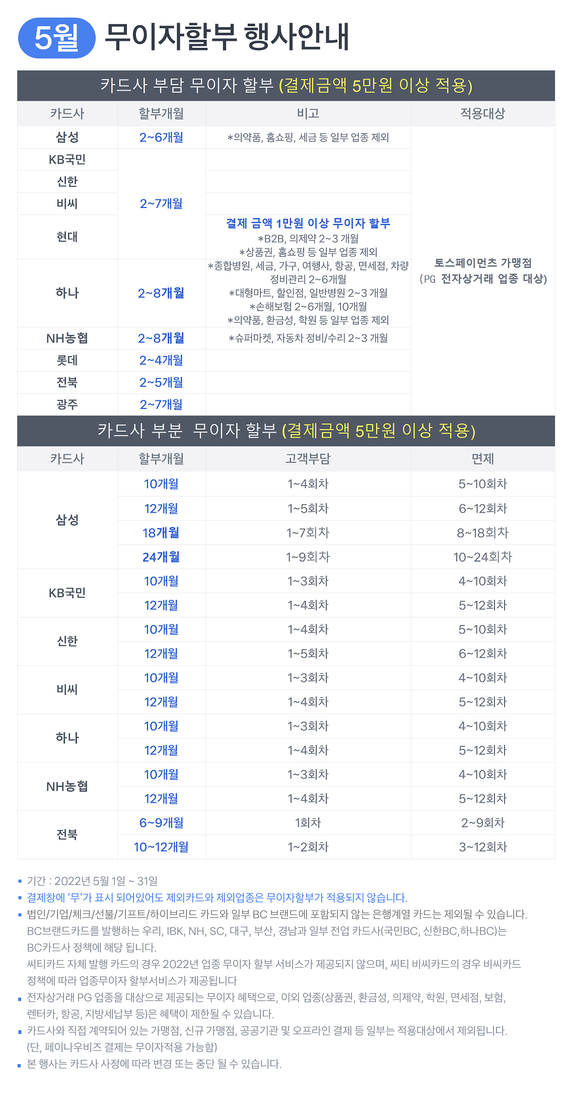 카드 무이자 할부 행사안내입니다. (부분 무이자 포함)