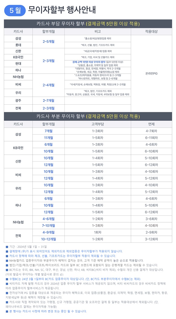​무이자 카드 행사안내입니다. (부분 무이자 포함)